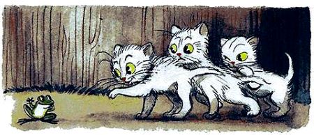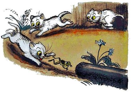 Три белых котёнка увидели на дворе лягушку и бросились за ней!