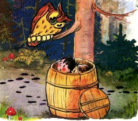 Ребята спрятались в бочку, но Баба-Яга сразу их обнаружила и приказала Филину: