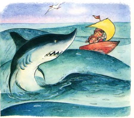 Ваня и Маша почувствовали себя в безопасности, но ненадолго: огромная чёрная Акула вынырнула из воды и погналась за лодкой.