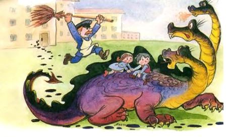 Змей Горыныч с ребятами на спине бросился наутёк… но дядя Федя догнал его. И досталось же Змею Горынычу!