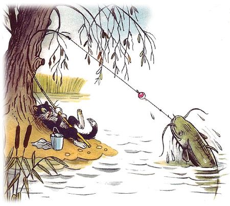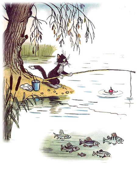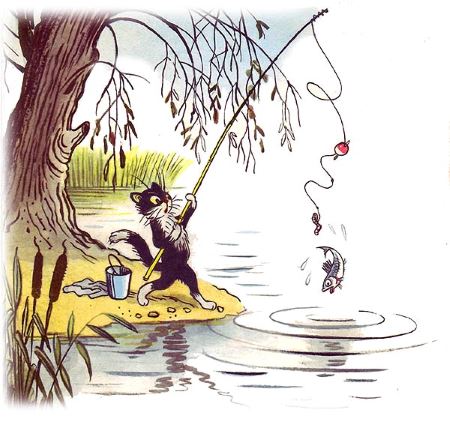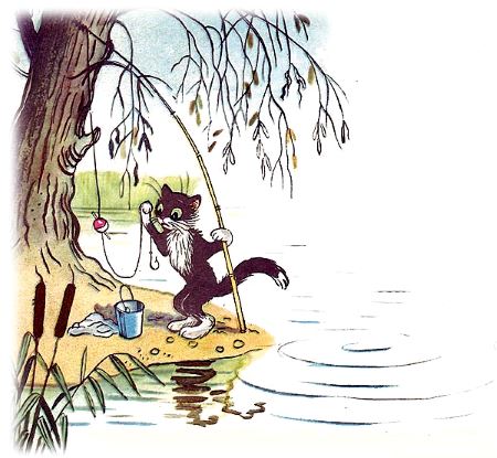 — Здравствуй, кум-куманёк, пушистый коток! Вижу, рыбку ловить собрался?